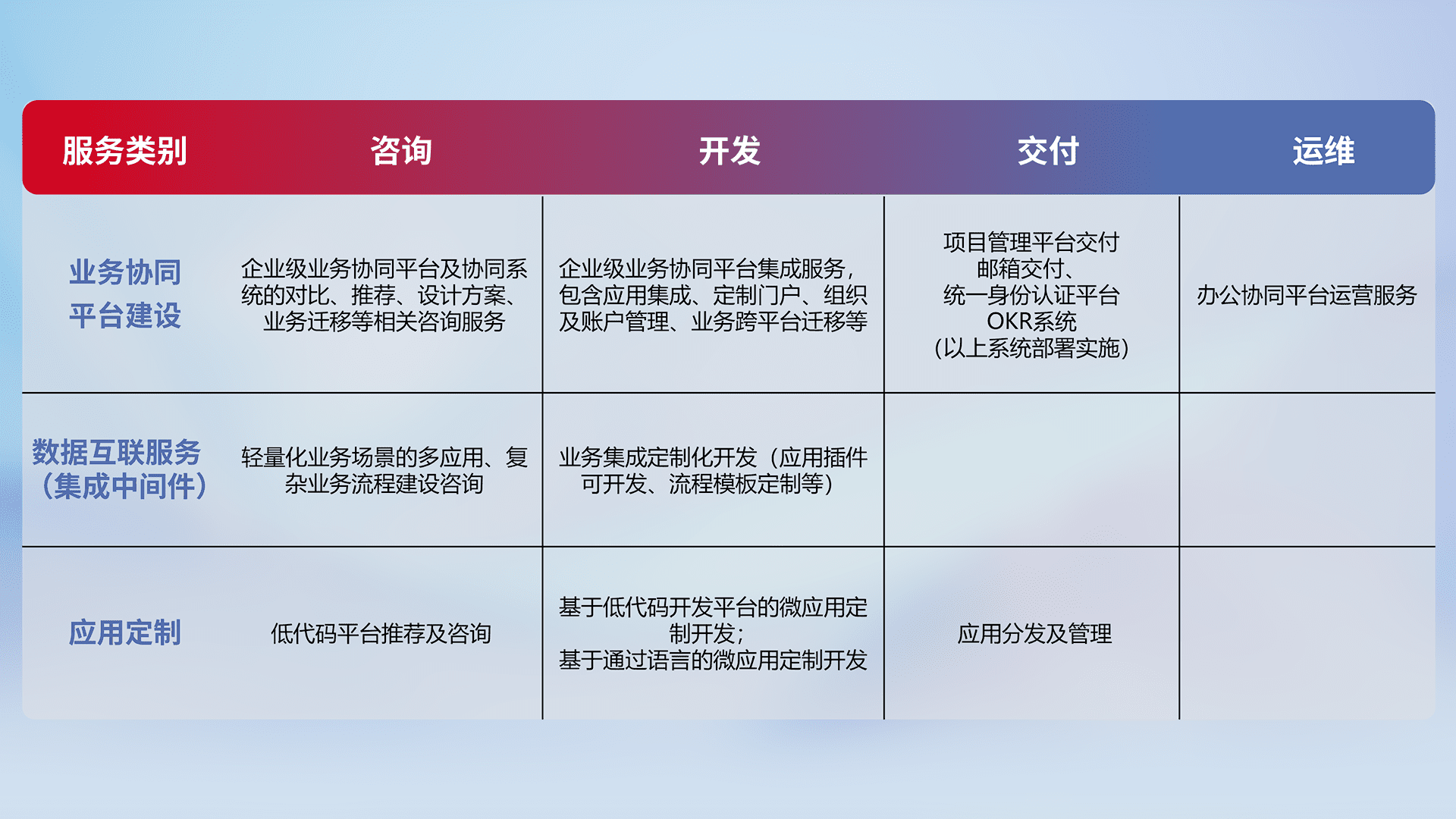 针对钉钉、、、、企微、、IDaas等平台级产品提供产品的规划、、方案、、、、交付、、定制化开发等服务,,实现如统一协同办公、、、智能客户服务、、混合会议管理、、、、智能数据查询、、、等业务场景,,,,实现数字化转型。。。。